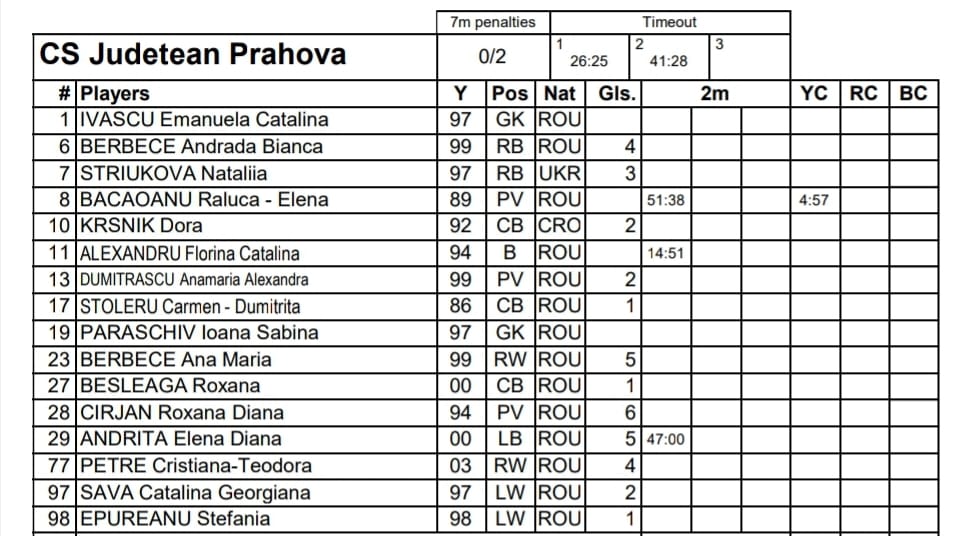 Lotul CSJ Prahova pentru aceasta partida a cuprins urmatoarele jucatoare: IVASCU Emanuela Catalina, BERBECE Andrada Bianca, STRIUKOVA Nataliia, BACAOANU Raluca – Elena, KRSNIK Dora, ALEXANDRU Florina Catalina, DUMITRASCU Anamaria Alexandra, STOLERU Carmen – Dumitrita, PARASCHIV Ioana Sabina, BERBECE Ana Maria, BESLEAGA Roxana, CIRJAN Roxana Diana, ANDRITA Elena Diana, PETRE Cristiana-Teodora, SAVA Catalina Georgiana, EPUREANU Stefania.